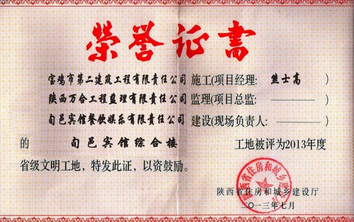 2013年省級(jí)文明工地(旬邑賓館綜合樓)