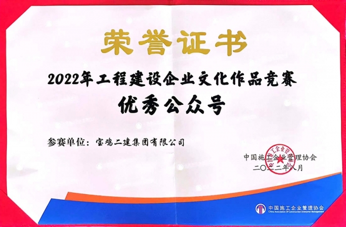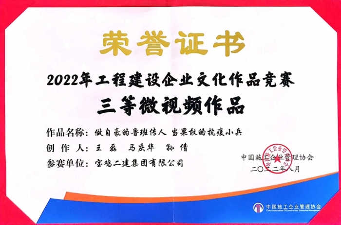 在喜迎二十大之際,中國施工企業(yè)管理協(xié)會在南寧隆重召開2022年度工程建設(shè)企業(yè)文化成果交流會,會議公布了2022年度工程建設(shè)企業(yè)文化作品競賽評選結(jié)果,并進(jìn)行表彰。寶雞二建公眾號被評為“全國工程建設(shè)行業(yè)優(yōu)秀公眾號”,企業(yè)文化作品《做自豪的魯班傳人 當(dāng)果敢的抗疫小兵》微視頻榮獲三等獎。